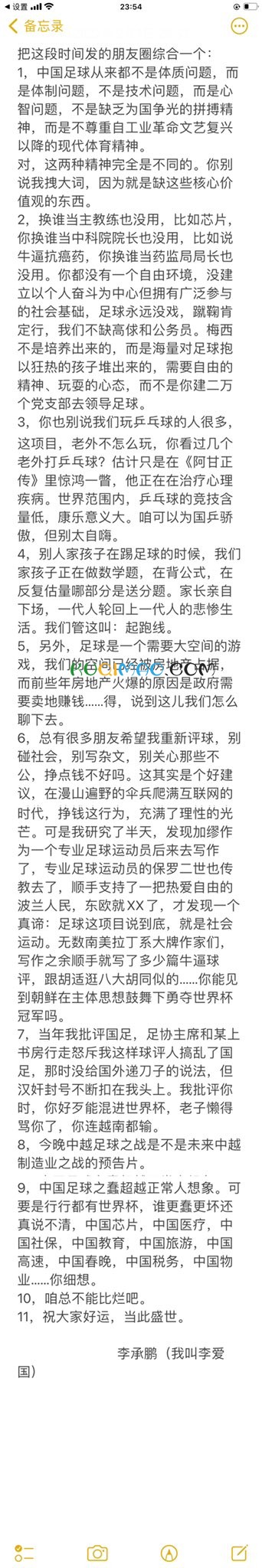 1,中国足球从来都不是体质问题,而是体制问题,不是技术问题,而是心智问题,不是缺乏为国争光的拼搏精神,而是不尊重自工业革命文艺复兴以降的现代体育精神。