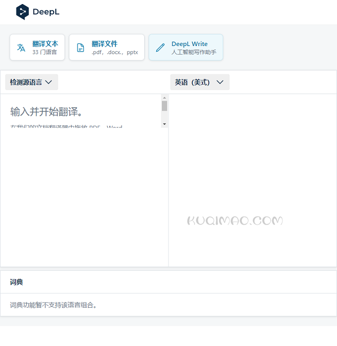 本站提供的DeepL翻译官网链接地址,源自互联网,在收录时,该网页上的内容,都属于合规合法,因为网址导航的特殊性,收录的网站域名会有过期、删除、重新注册等情况,酷奇猫网不声明也不保证该链接的正确性和可靠性,请仔细考虑清楚后,再进行访问,如有风险自行承担。